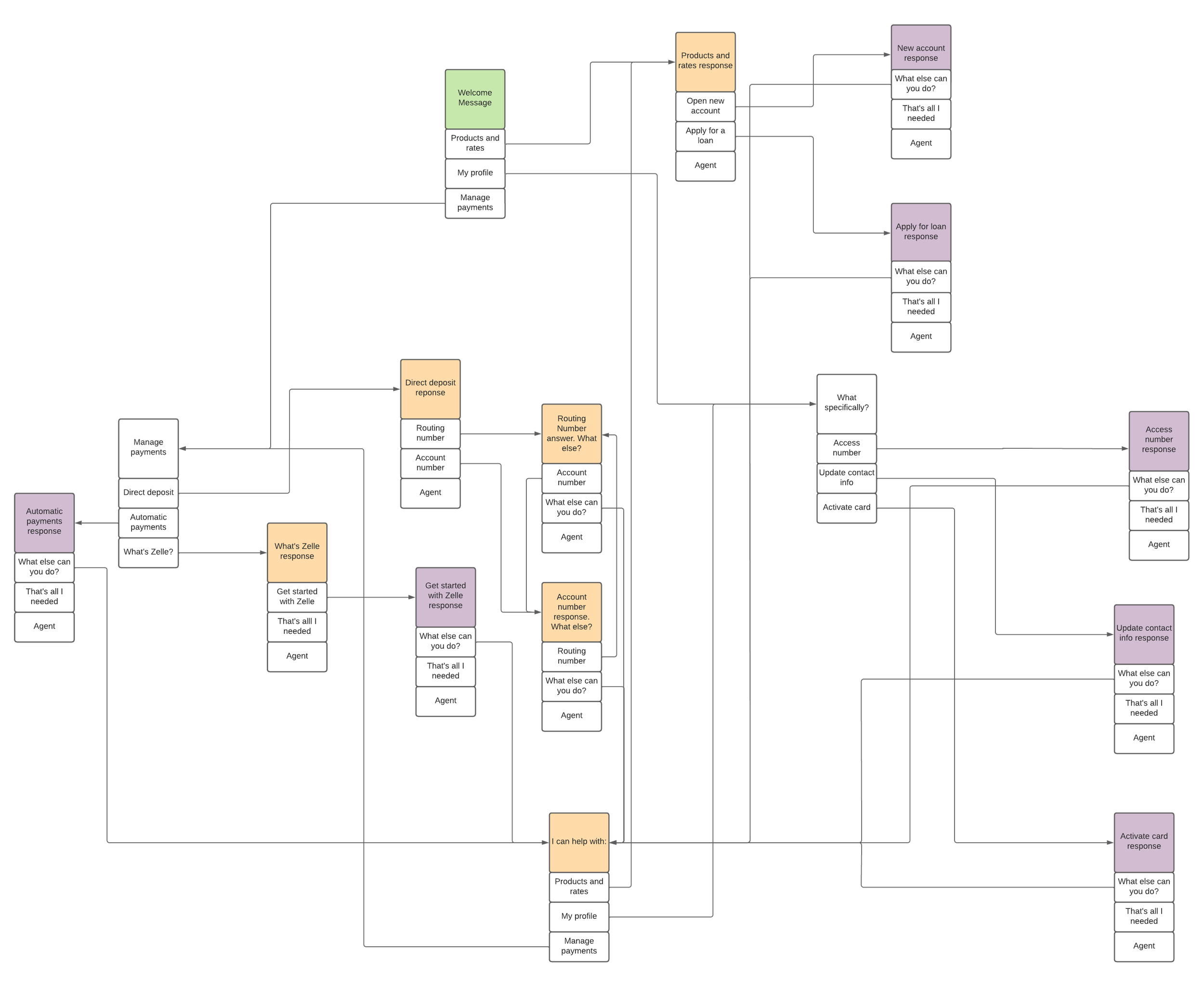 I proposed a system of categorization, using menus and a branching content structure. We added 2 category buttons, and by updating certain responses to imply connections between the topics of direct deposit, account numbers & routing number, I proposed a cyclical flow that met all requirements while remaining within our technical limitations.